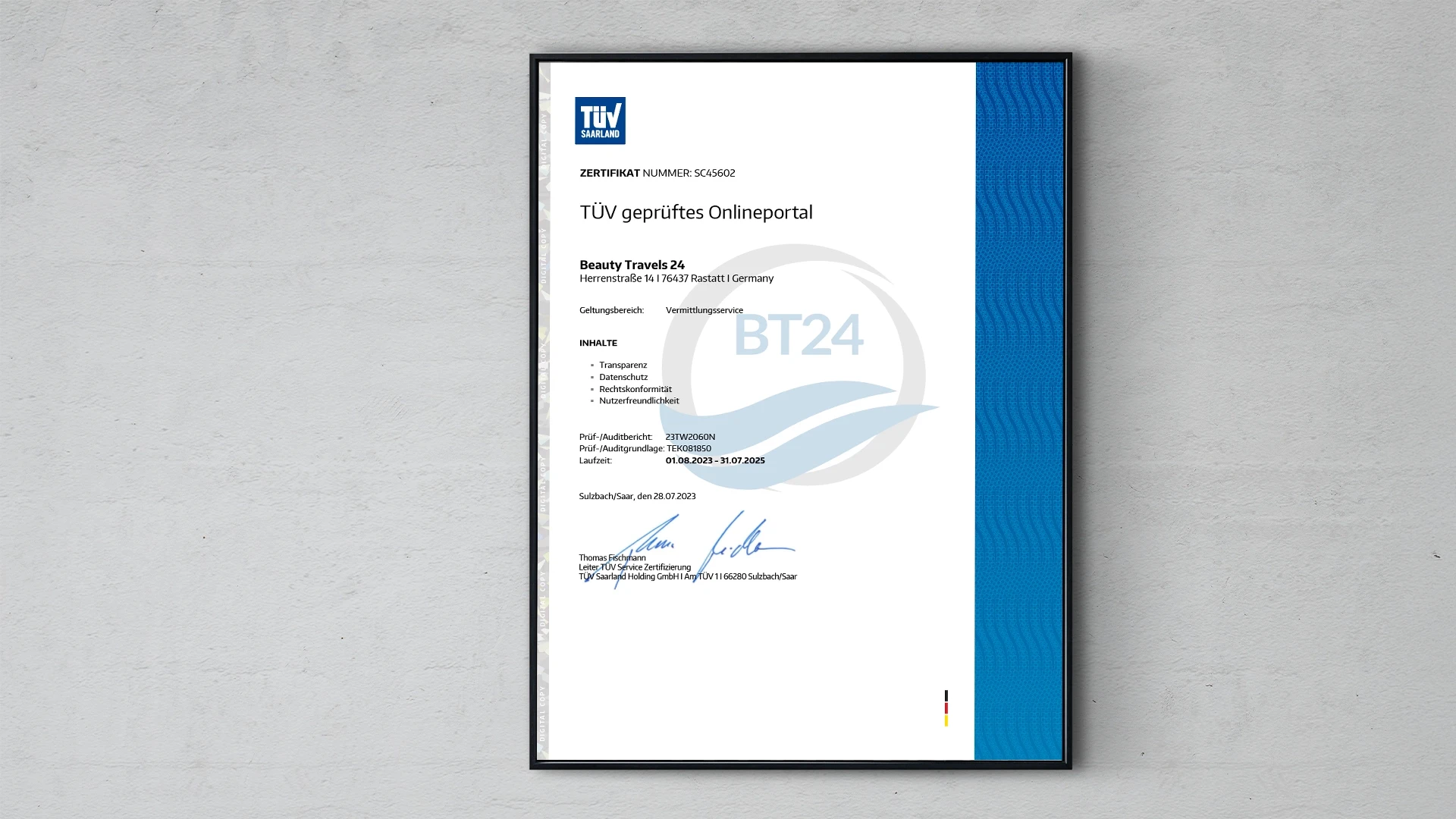 Als erste Agentur im Bereich Gesundheitstourismus erhielt Beauty Travels 24 die TÜV-Zertifizierung für Servicequalität – ein neutral geprüftes Qualitätsversprechen, das bis heute jährlich erneuert wird. Dieser Schritt machte Beauty Travels 24 zum Synonym für geprüfte Qualität und Verlässlichkeit.